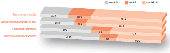 L’exploitation commerciale par l’éditeur : Si en 4 ans le taux de satisfaction a augmenté de 8 points (42% d’auteurs satisfaits du travail de leur éditeur en 2015, contre 34% en 2010), les auteurs sont encore 42% à être toujours insatisfaits.