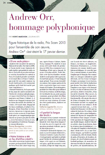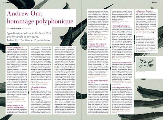 Figure historique de la radio, Prix Scam 2015 pour l’ensemble de son oeuvre, Andrew Orr s’est éteint le 17 janvier dernier. Un article du journaliste Hervé Marchon pour la lettre Astérisque n°62.