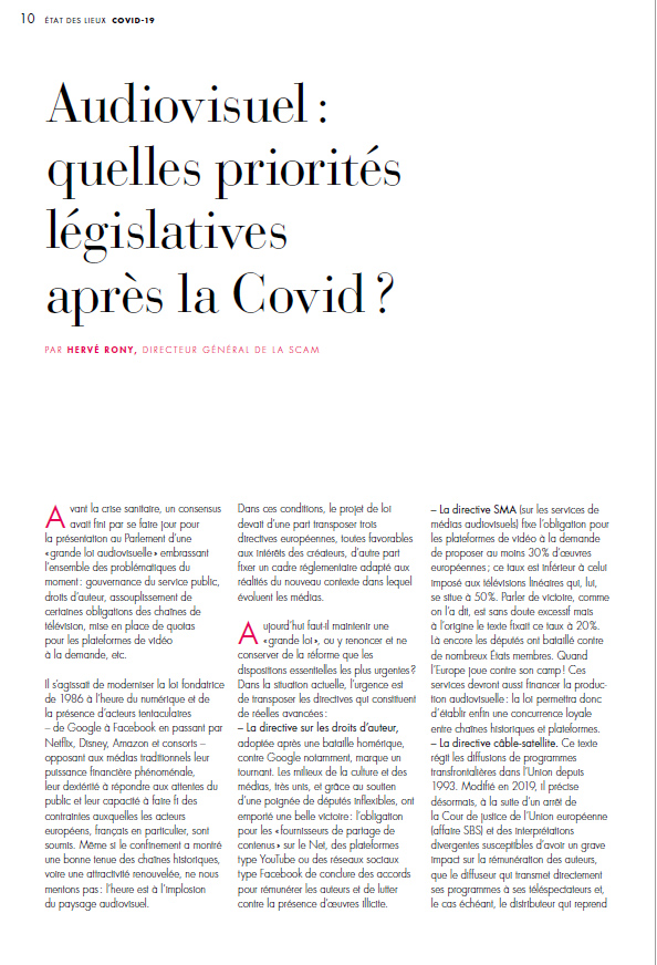 La crise sanitaire et son corollaire, la crise économique, vont peser dramatiquement sur les créateurs. Dans ce contexte, si les dispositions du projet de loi audiovisuelle conservent tout leur sens, c’est aussi et surtout un plan de relance de la filière culture et médias qui s’impose.