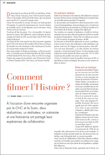 Il continue de fixer les pavés. « Oui, c’est possible », lui répond, derrière la caméra, Ruth Zylberman, autrice-réalisatice du documentaire Les Enfants du 209, rue saint Maur, Paris Xe (2017, Arte, Zadig Productions). Cet extrait du film a été visionné lors de la rencontre organisée par le CNC et la Scam le 28 novembre 2018 à Paris sur la façon de travailler avec des chercheurs et des chercheuses à l’écriture d’un documentaire traitant de l’Histoire. Deux autres extraits ont illustré ces échanges : un film de reconstitution, Le Versailles secret de Marie-Antoinette de Sylvie Faiveley et Mark Daniels (2018, Arte France, ZED), et un film de montage, L’Utopie des images de la révolution russe d’Emmanuel Hamon et Thomas Cheysson (2017, Arte France, Les Poissons Volants).