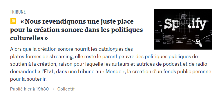 Dans la mesure où les revenus d’abonnement des plateformes sont à mettre au crédit de la musique et des podcasts, nous demandons que la discussion engagée intègre les représentants des auteurs et producteurs de podcasts et que le mécanisme retenu de financement de la création profite à la fois à la musique et au podcast. Il s’agit de donner enfin une place à la création sonore dans les politiques culturelles, et de construire ce nouvel outil dans la plus parfaite équité.