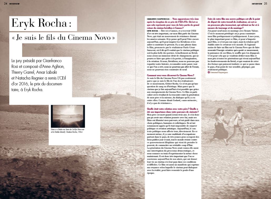 Le jury présidé par Gianfranco Rosi et composé d’Anne Aghion, Thierry Garrel, Amar Labaki et Natacha Regnier a remis L’Œil d’or 2016, le prix du documentaire, à Eryk Rocha. Le lauréat revient sur son parcours avec Emmanuel Raspiengeas. Une interview publiée dans Astérisque n°55.