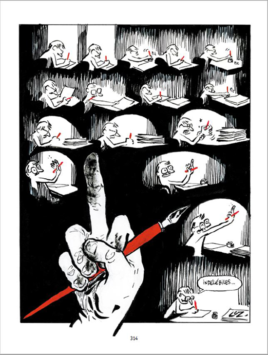 « Il y a le souvenir, il y a la mémoire. Restent des traces. Il y a les tâches. Qui reviennent au bout des doigts. Il y a les amis. Au coin d’une pensée qui, tant mieux, ne s’efface pas. Il y a le journal. À moins que Charlie Hebdo n’ait été bien plus que quelques feuilles de papiers. (…) On commence, on monte à Paris, on n’est qu’un brouillon de soi-même. Une page à noircir. On rencontre des gens, des talents, des parents. Dessiner, putain, quel beau métier ! Y’a pas moyen : ça part pas. Eux non plus. Indélébiles. » Luz
