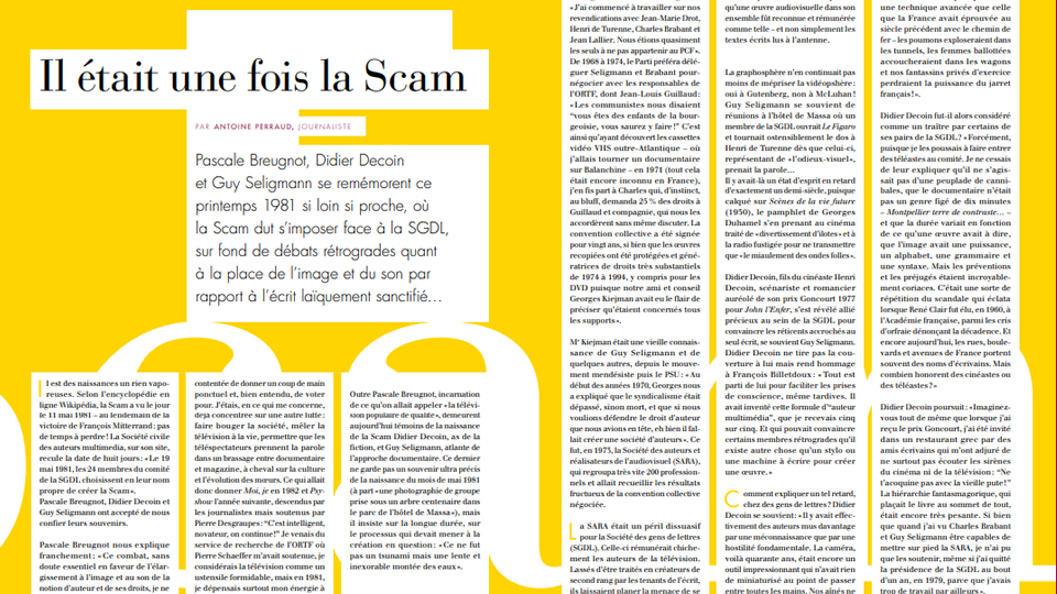 Outre Pascale Breugnot, incarnation de ce qu’on allait appeler « la télévision populaire de qualité », demeurent aujourd’hui témoins de la naissance de la Scam Didier Decoin, as de la fiction, et Guy Seligmann, atlante de l’approche documentaire. Ce dernier ne garde pas un souvenir ultra précis de la naissance du mois de mai 1981 (à part « une photographie de groupe prise sous un arbre centenaire dans le parc de l’hôtel de Massa »), mais il insiste sur la longue durée, sur le processus qui devait mener à la création en question : « Ce ne fut pas un tsunami mais une lente et inexorable montée des eaux ».