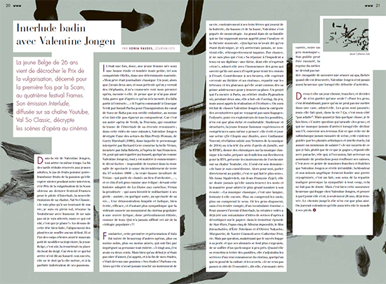 La jeune Belge de 26 ans vient de décrocher le Prix de la vulgarisation, décerné pour la première fois par la Scam, au quatrième festival Frames. Son émission Interlude, diffusée sur sa chaîne Youtube, Val So Classic, décrypte les scènes d’opéra au cinéma. Un article de la journaliste Sonia Vaudes, pour la lettre Astérisque n°64.