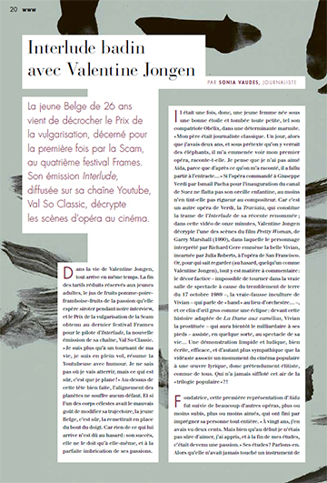 La jeune Belge de 26 ans vient de décrocher le Prix de la vulgarisation, décerné pour la première fois par la Scam, au quatrième festival Frames. Son émission Interlude, diffusée sur sa chaîne Youtube, Val So Classic, décrypte les scènes d’opéra au cinéma. Un article de la journaliste Sonia Vaudes, pour la lettre Astérisque n°64.