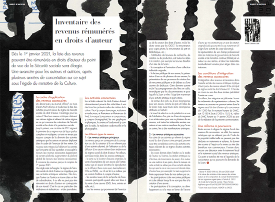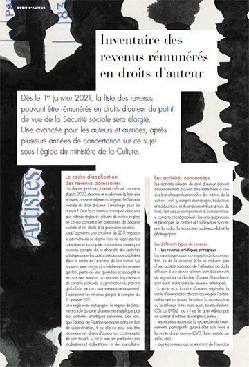 Dès le 1er janvier 2021, la liste des revenus pouvant être rémunérés en droits d’auteur du point de vue de la Sécurité sociale sera élargie. Une avancée pour les auteurs et autrices, après plusieurs années de concertation sur ce sujet sous l’égide du ministère de la Culture. Article publié dans la lettre Astérisque n°66.