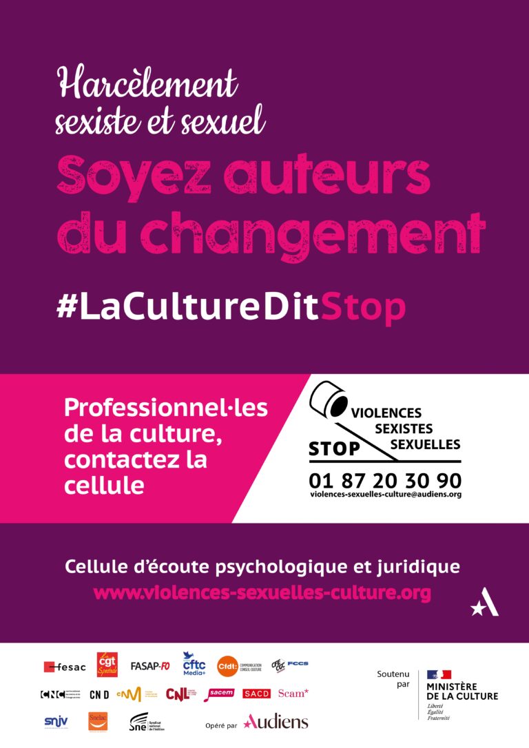 Dans la continuité de son engagement constant en faveur de la parité (cf notre enquête annuelle sur l’égalité Femme-Homme), de son action sociale auprès des créatrices et créateurs, de sa mobilisation contre toutes les discriminations, la Scam vient de s’associer à la Cellule d’Écoute Audiens, gratuite et anonyme à destination des victimes ou des témoins de viol, de harcèlement sexuel, de violences sexistes et sexuelles dans le secteur du spectacle vivant, de l’audiovisuel ou du cinéma *.