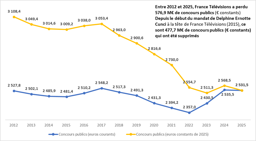 En 10 ans (ce qui correspond aussi au premier mandat de Delphine Ernotte), France télévisions a perdu près de 480M€ en euros constants.