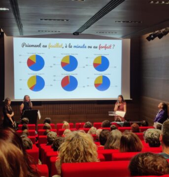 Après un rappel de l’évolution des traductions déclarées à la Scam par Franck Laplanche, Directeur Général adjoint de la Scam, Isabelle Brulant, Marion Chesné et Pauline Lelièvre ont présenté les résultats d’une étude dressant un état des lieux des conditions de travail et des tarifs pratiqués sur le Voice-over dans l’objectif de disposer de chiffres concrets pour entamer des négociations auprès des labos et des diffuseurs pour une rémunération plus juste.
