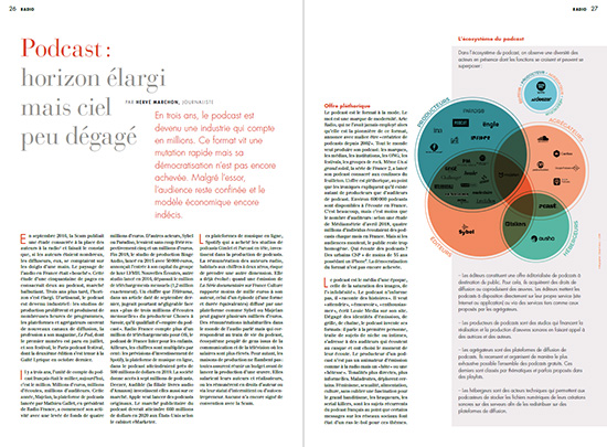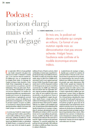 En septembre 2016, la Scam publiait une étude consacrée à la place des auteurs à la radio et faisait le constat que, si les auteurs étaient nombreux, les diffuseurs, eux, se comptaient sur les doigts d’une main. Le paysage de l’audio en France était « bouché ». Cette étude d’une cinquantaine de pages en consacrait deux au podcast, marché balbutiant. Trois ans plus tard, l’horizon s’est élargi. D’artisanal, le podcast est devenu industriel : les studios de production prolifèrent et produisent de nombreuses heures de programmes, les plateformes et agrégateurs ouvrent de nouveaux canaux de diffusion, la profession a son magazine, Le Pod, dont le premier numéro est paru en juillet, et son festival, le Paris podcast festival, dont la deuxième édition s’est tenue à la Gaîté Lyrique en octobre dernier.