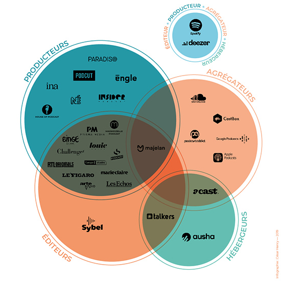 Dans l’écosystème du podcast, on observe une diversité des acteurs en présence dont les fonctions se croisent et peuvent se superposer :