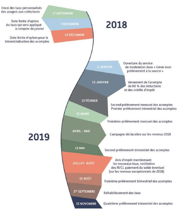 La demande de modulation doit être effectuée au plus tard le 23 du mois pour être applicable le mois suivant. Cette possibilité sera ouverte à compter du 2 janvier 2019. Début février 2019, il sera possible de demander sur impôts.gouv.fr le remboursement du supplément d’impôt qui aurait été acquitté par application d’un taux de prélèvement excessif au regard de la modulation sollicitée. Le remboursement devrait intervenir sous un délai d’un mois.