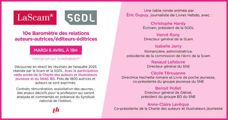 Mardi 8 avril de 18h à 19h30, inscrivez-vous pour suivre le direct, la présentation de l’enquête bisannuelle réalisée par la Scam et la SGDL auprès des autrices et auteurs du livre, avec la participation cette année de la Charte des auteurs et illustrateurs jeunesse et du SNAC BD.