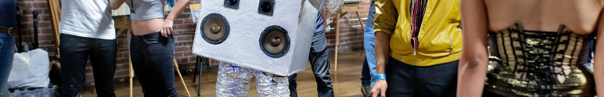 Chris Hirst dans son costume « Robot Dance Party » avec haut-parleurs intégrés, lors d’une fête organisée par les résidents de 20 Mission, un complexe de co-living où vivent de nombreux entrepreneurs de start-up. Leurs fêtes très élaborées devenant trop importantes pour leur espace, ils louent désormais des salles dans le centre-ville. San Francisco, Californie, juillet 2015.
