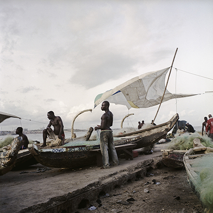 « Depuis quelques années maintenant, je voyage régulièrement au Ghana, un pays que j’ai découvert dans le livre de Paul Strand « Ghana : an african portrait », et dont j’ai fini par rêver les images. Lors de mes premiers voyages, le quartier de Jamestown s’est imposé à moi comme lieu central de mon travail. Situé au bord de la mer, ce quartier historique abrite le port de pêche d’Accra, la capitale ghanéenne. Cette petite bande de sable, coincée entre mer et ville, semble également prise entre tradition et modernité. La simplicité qui y règne, les corps qui y évoluent, les lumières de la mer m’ont fasciné et j’y ai trouvé les images que je cherchais. À chaque fois que je retourne à Accra, Jamestown m’offre toujours des scènes éblouissantes. »