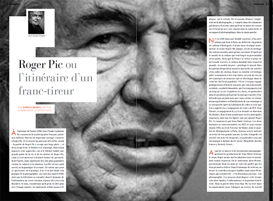 À l’automne de l’année 2000, Jean-Claude Gautrand, fin connaisseur de la photographie française, publie aux éditions Marval un imposant ouvrage consacré à Roger Pic. Il en ressort un parcours très riche, vivant – la parole de Roger Pic y occupe une large place –, et deux temps forts : le théâtre et le reportage. Mais il faut nuancer cette approche, car si le théâtre habite une grande partie de la vie et de la carrière de Roger Pic, celui-ci s’est intéressé à d’autres formes de spectacle, dont l’opéra, mais également des arts plus populaires comme le cabaret et la chanson. Car Pic est un esprit ouvert, ni dogmatique ni sectaire. De même que pour ce qui touche au reportage, il ne s’est pas limité à la pratique de la photographie : au cours des années 1960, alors que la télévision va connaître dans le domaine de l’information un essor constant, il passe du Leica à la Beaulieu 16 mm, considérant qu’il peut en dire plus avec l’image animée. Ici également, il faut nuancer le propos : sur le terrain, Pic n’a jamais délaissé complètement la photographie, y compris dans des situations périlleuses. Il raconte ainsi qu’il lui est arrivé de couvrir un événement avec une caméra dans la main droite et un appareil photographique dans la main gauche.
