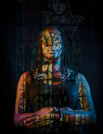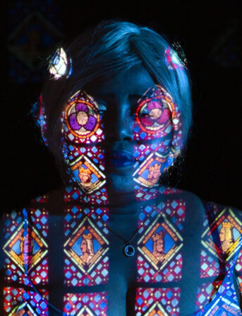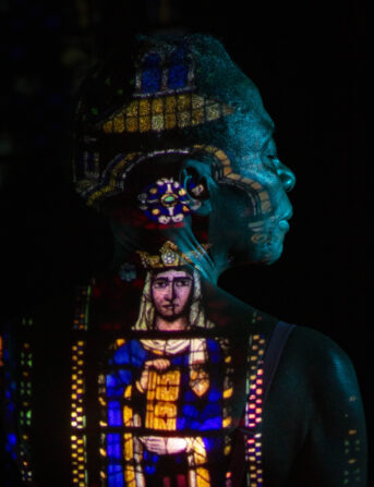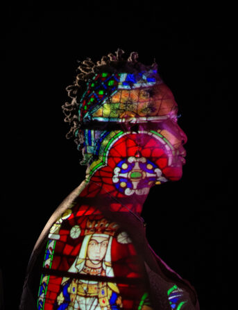 Une fois établie la confiance, ces Dionysiennes et ces Albertivillariennes ont accepté de poser pour l’artiste, qui entendait saisir le parcours et la personnalité de chacune de ces « néo-souveraines » méconnues, repérées dans les plis précaires de la banlieue nord. Une telle révélation – ne parle-t-on pas de révélateur en photographie ? – s’accompagne, dans la basilique, de la projection, sur ces portraits du XXIe siècle, de fragments de vitraux médiévaux représentant les reines historiques, donnant à cette série de clichés une épaisseur temporelle doublée d’une beauté hybride, étrange ; une beauté à la fois si profane et un rien sacrée : trente-deux femmes mosaïques devenues. Ainsi le morcellement apparaît-il réparateur, à la manière du « Kinsugi », cet art japonais qui consiste à recoller des poteries en miettes avec de la feuille d’or, les rendant alors plus précieuses qu’avant la casse.